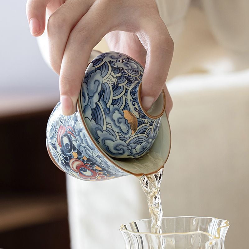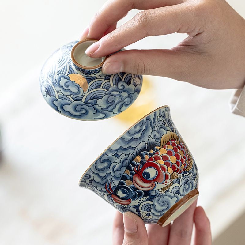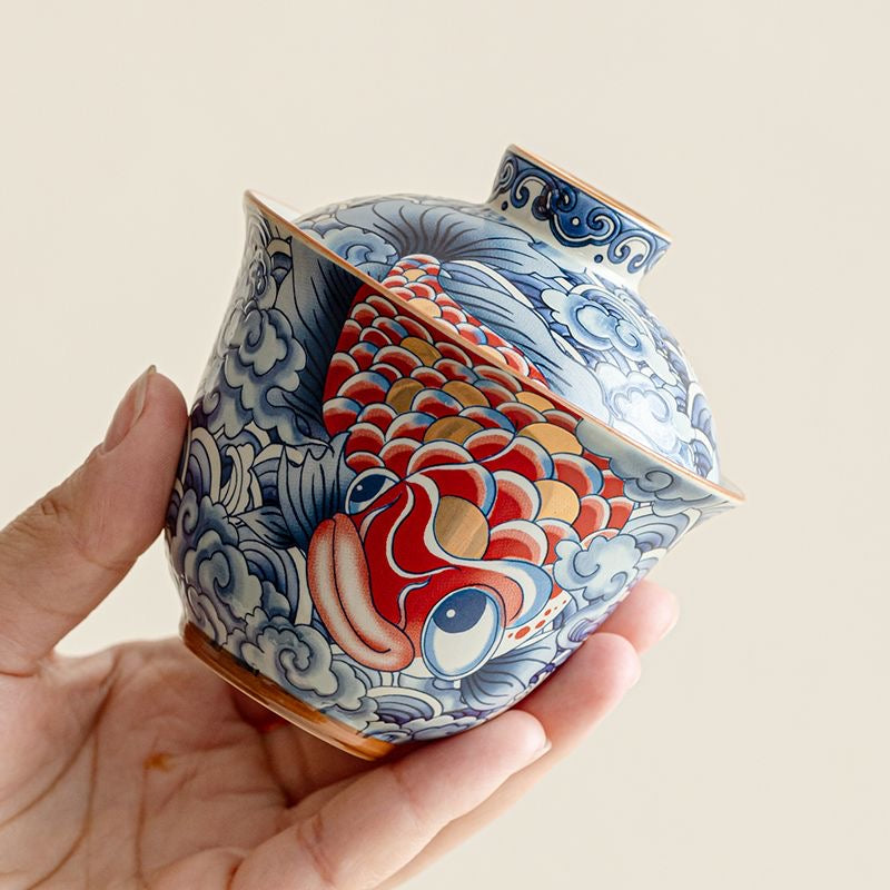 A compact 100ml ceramic gaiwan for Gongfu tea brewing, featuring a bold koi fish motif over a blue cloud/wave pattern with warm rim accents. Made in Fujian, China with a decal/transfer (贴绘) technique, this lidded gaiwan is ideal for single-serve sessions, tasting flights, and fast, controlled pours—an everyday piece of Chinese teaware for modern tea ritual and traditional Gongfu cha.
