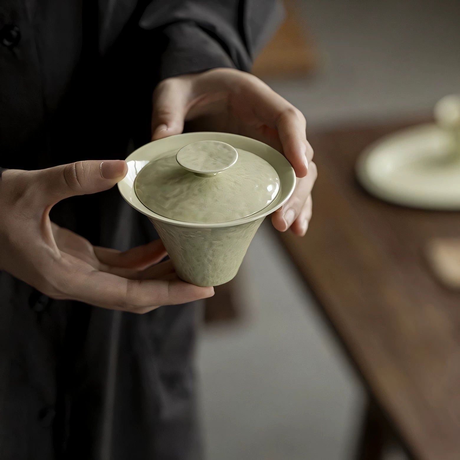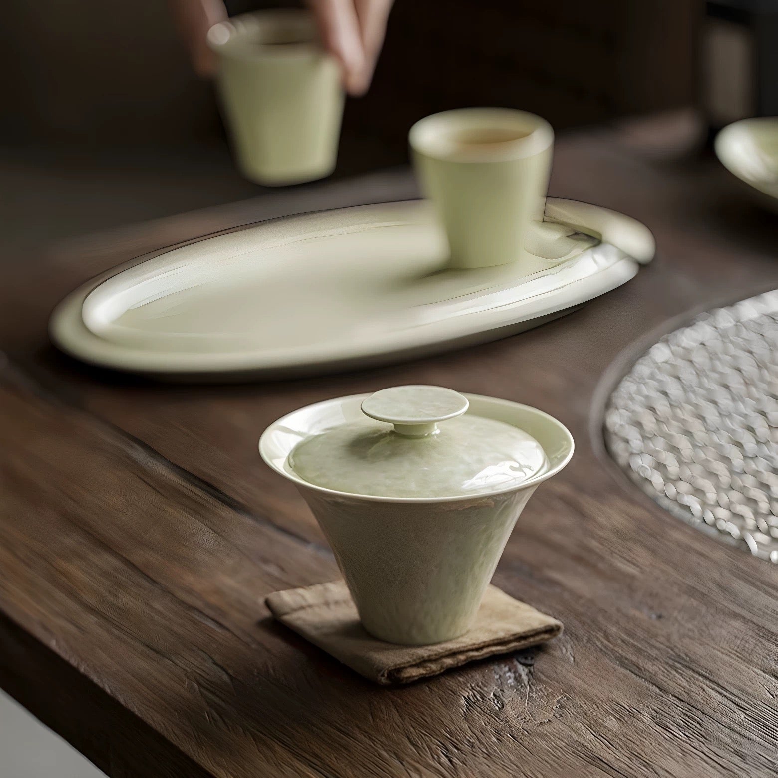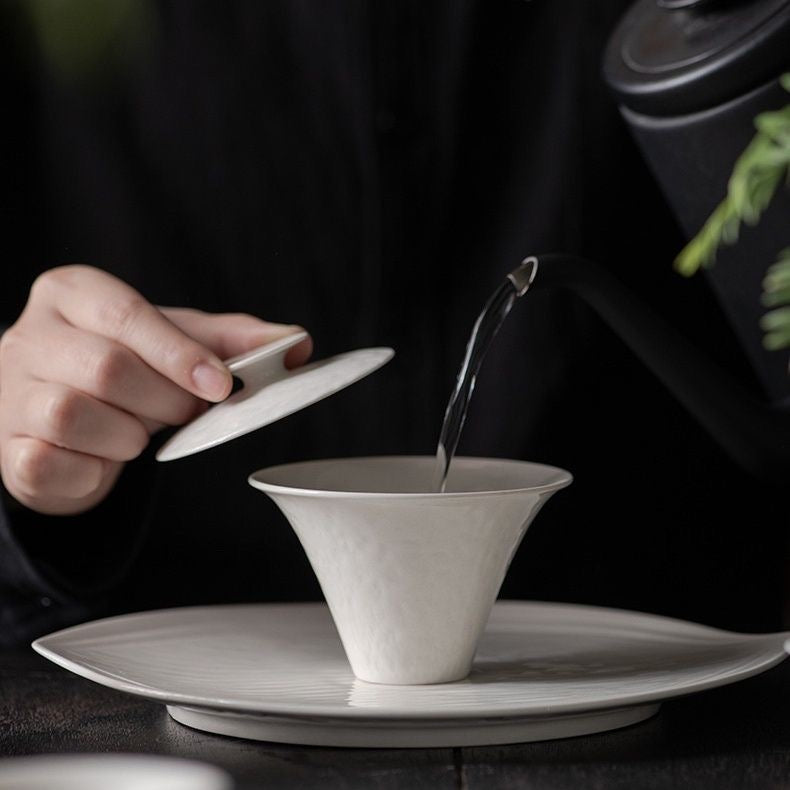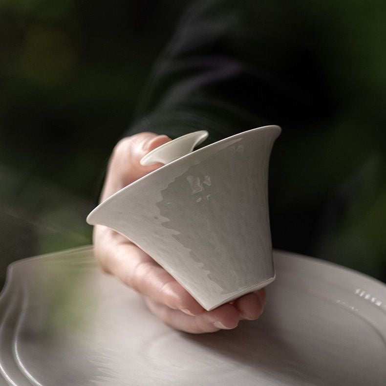 Clean, calm, and quietly tactile—this Dehua ceramic gaiwan features a soft Grass & Wood Ash tone with a subtle hammered-texture inspired surface that catches light beautifully. The flared silhouette feels modern and balanced in the hand, making it an effortless everyday gongfu tea gaiwan for a neat, minimalist tea setup.