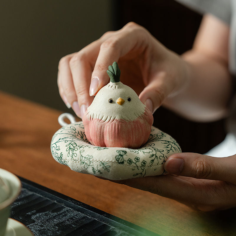 Add a whimsical and artistic touch to your gongfu tea ceremony with this charming Garlic Bird tea pet. Handcrafted from authentic Zisha clay (Purple Clay), this figurine combines the playful form of a garlic bulb at the base with a cute bird perched on top, making it a delightful decoration for your tea tray and an inspiring companion for your kung fu tea rituals.
