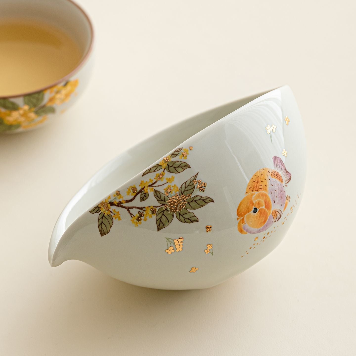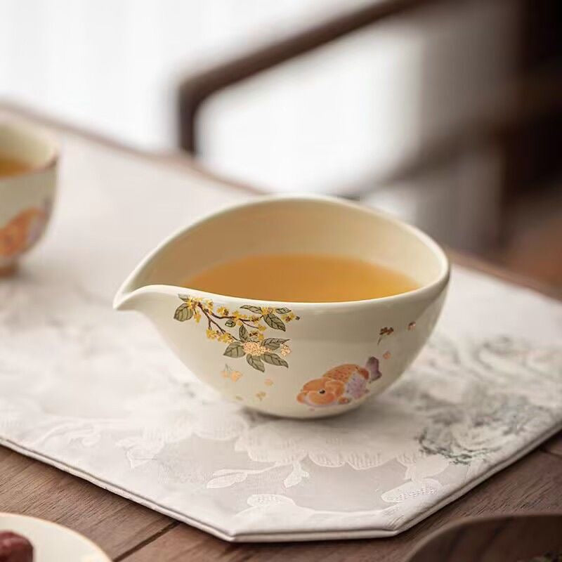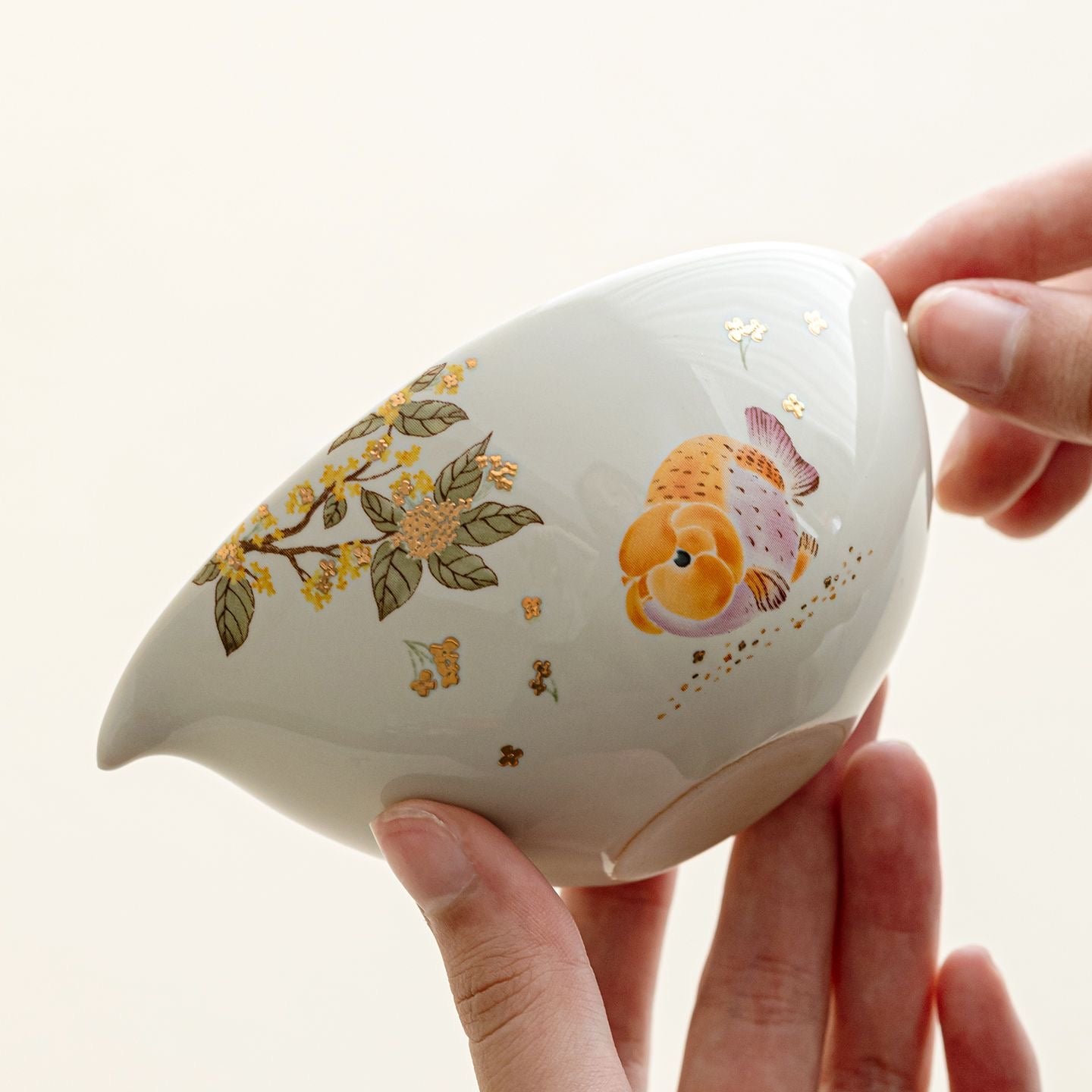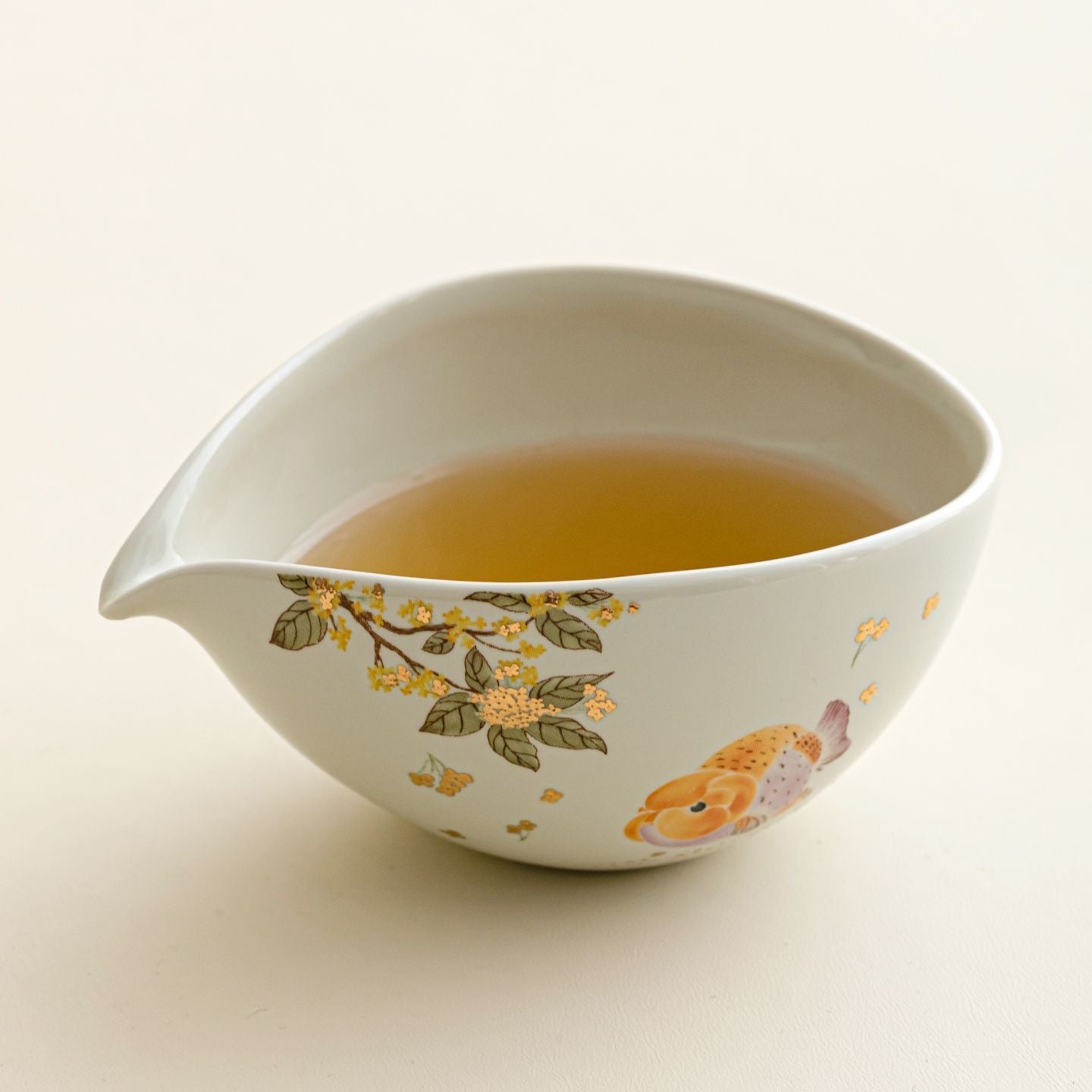 A refined gongdao bei (cha hai) fairness cup created for classic Chinese gongfu tea aesthetics. The warm, creamy wood-ash glaze pairs with a graceful “Moon-Boat” silhouette, finished with an elegant osmanthus-and-goldfish motif for a quiet, oriental charm.
