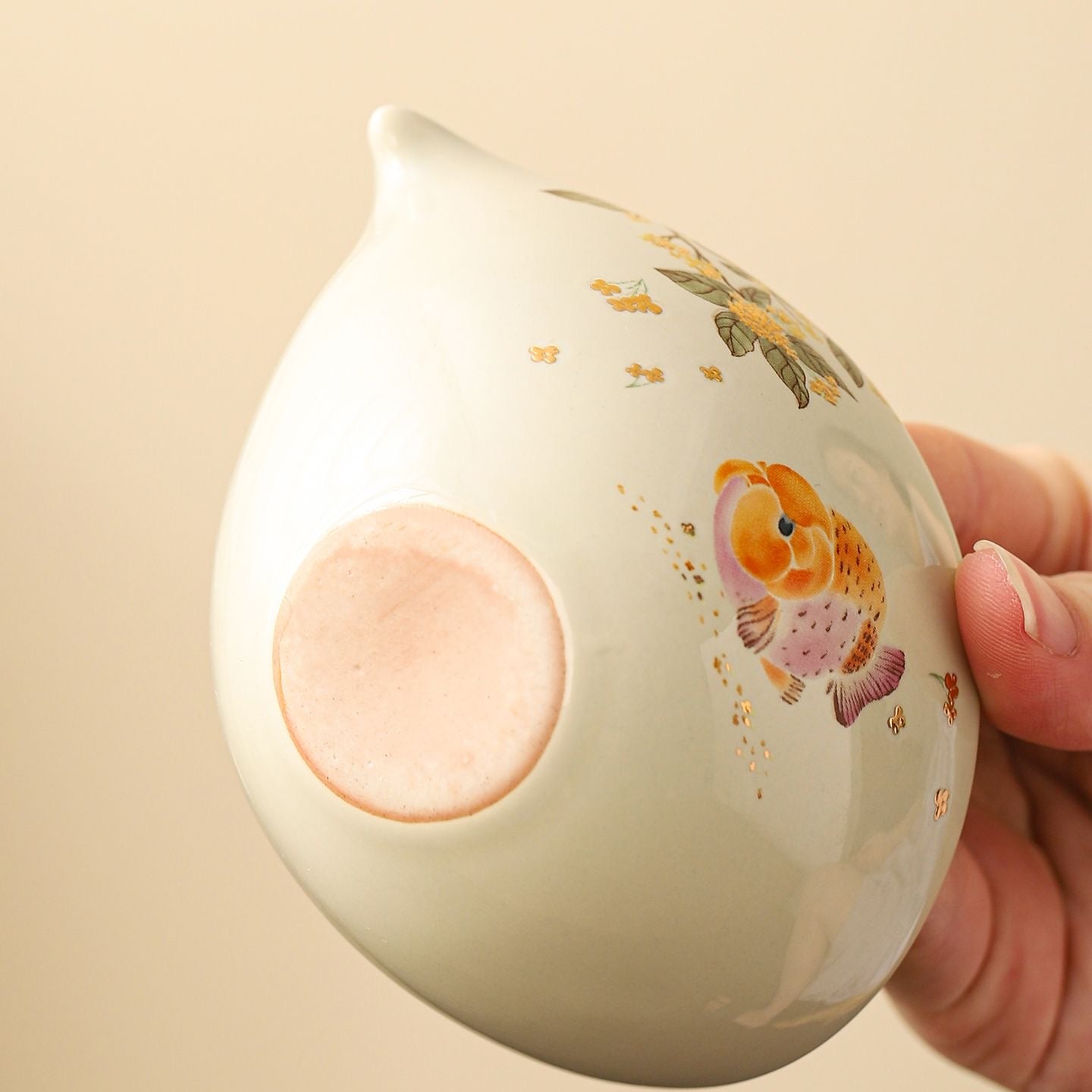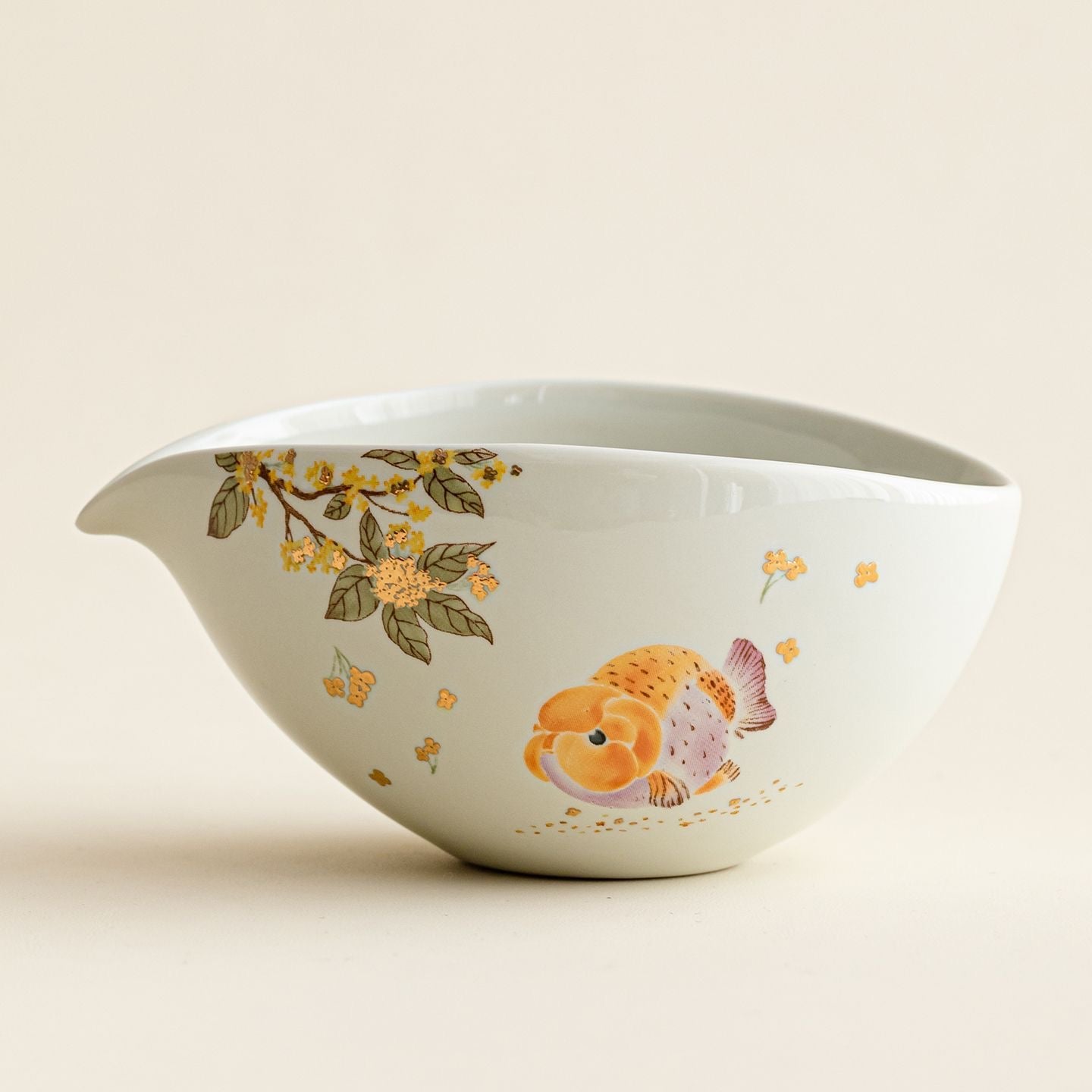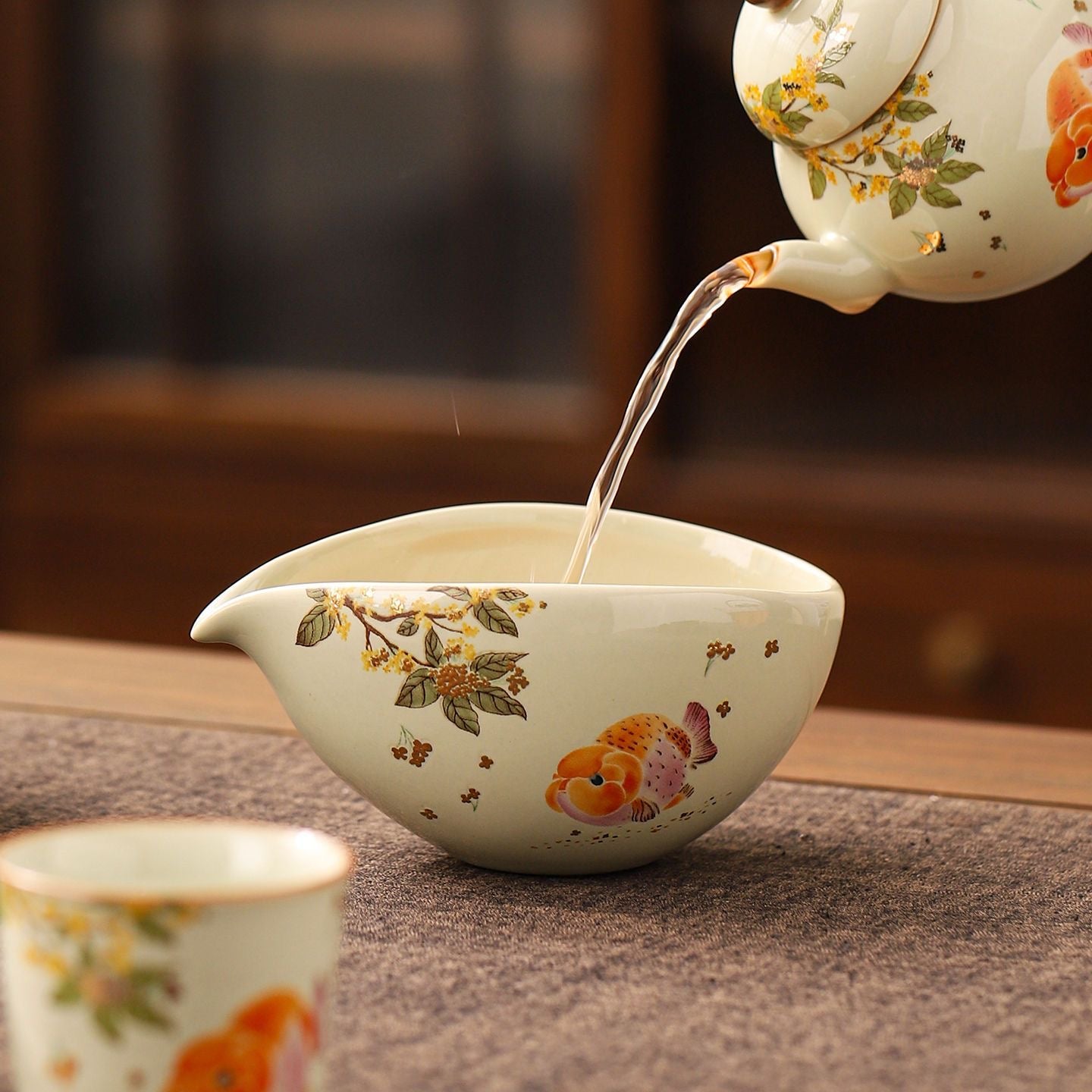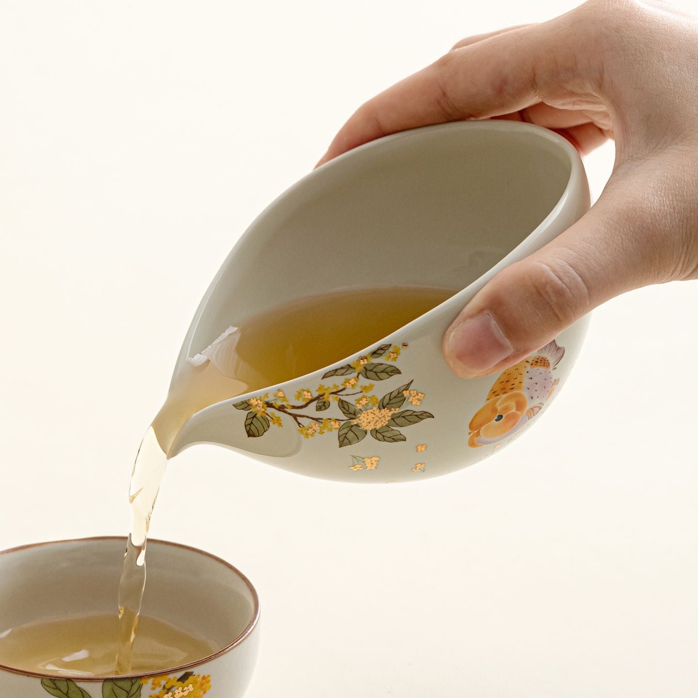 A refined gongdao bei (cha hai) fairness cup created for classic Chinese gongfu tea aesthetics. The warm, creamy wood-ash glaze pairs with a graceful “Moon-Boat” silhouette, finished with an elegant osmanthus-and-goldfish motif for a quiet, oriental charm.