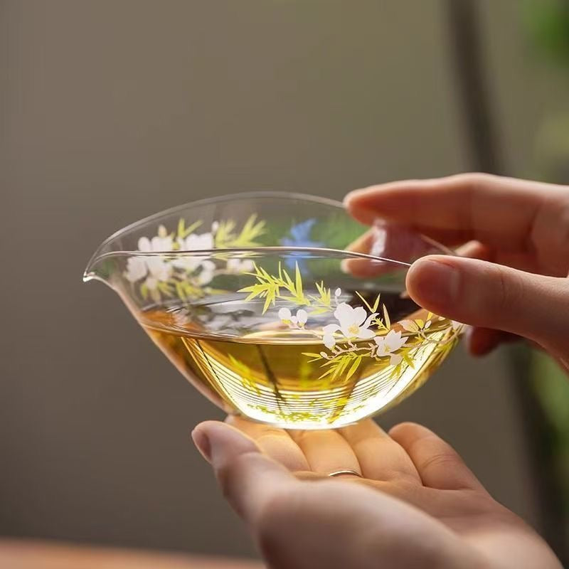 This hand-painted Gong Dao Bei features an elegant twisted-square silhouette and a delicately brushed dragon motif, bringing artistic beauty to your Gongfu tea table. Crafted from high-transparency, heat-resistant borosilicate glass, it highlights the color and clarity of your brew. The tapered spout delivers smooth, drip-free pouring—ideal for sharing Pu-erh, black tea, or any Chinese tea with precision and grace. A refined addition to any Gongfu tea set.