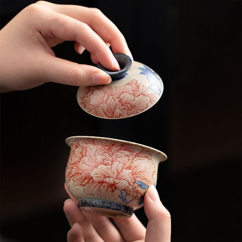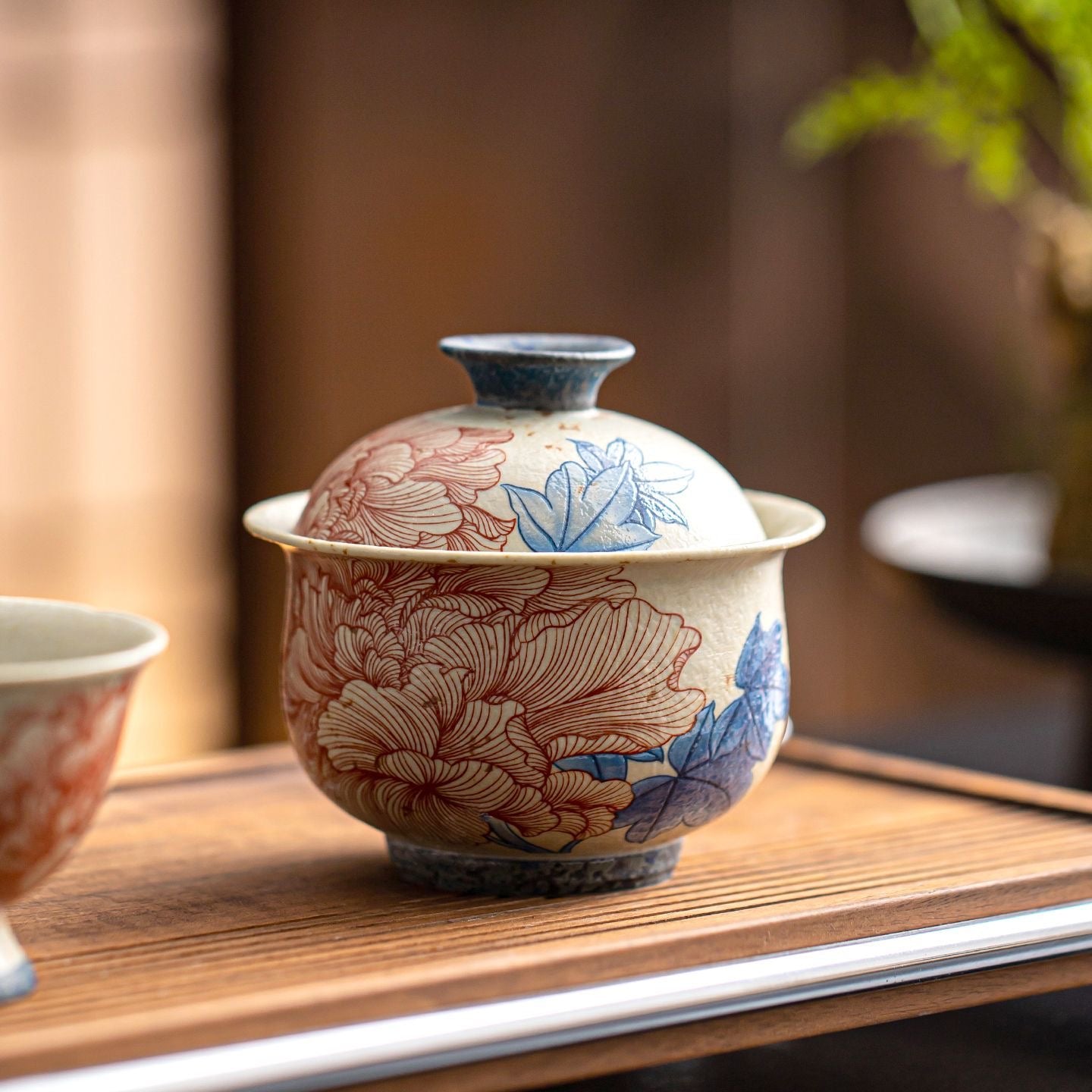 A handmade, personal 140ml ceramic gaiwan from Dehua, China, finished with a classic blue and iron-red floral painting. Compact and easy to handle for everyday Gongfu tea brewing, with a comfortable lid fit for clean, controlled pouring and quick infusions.