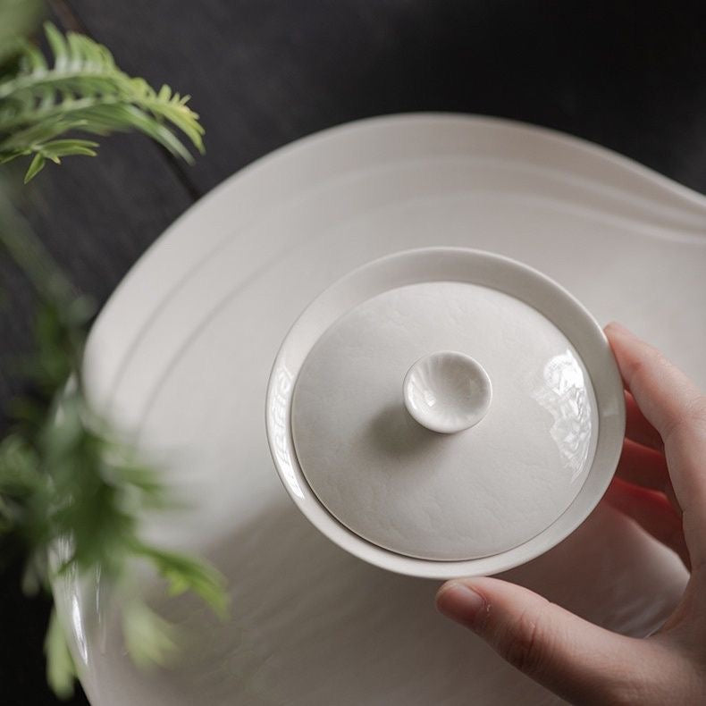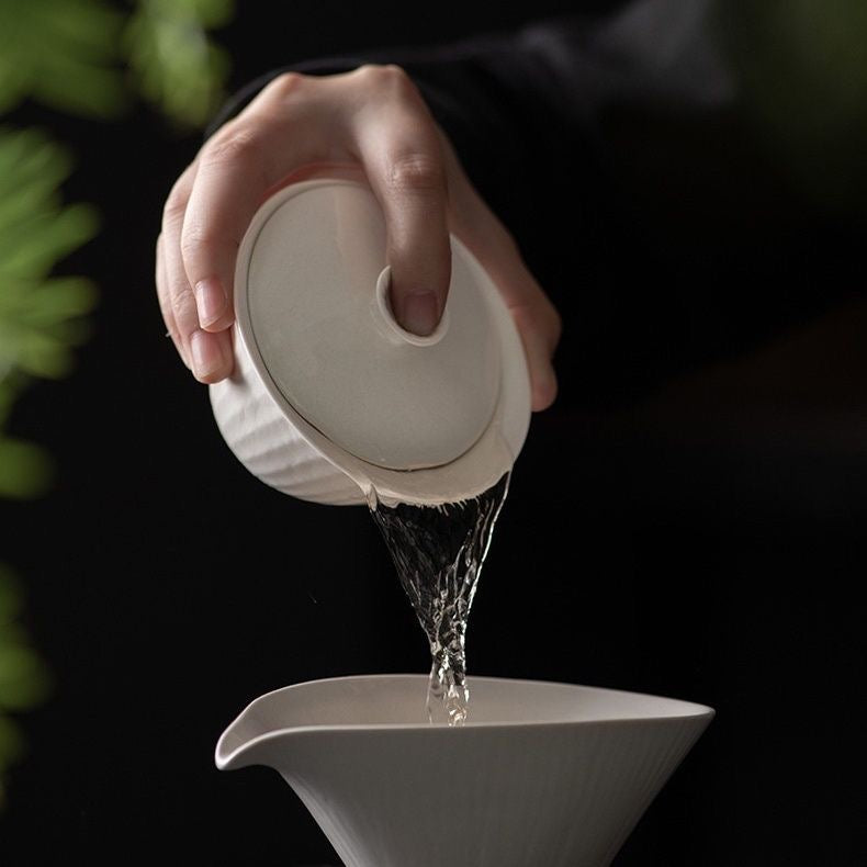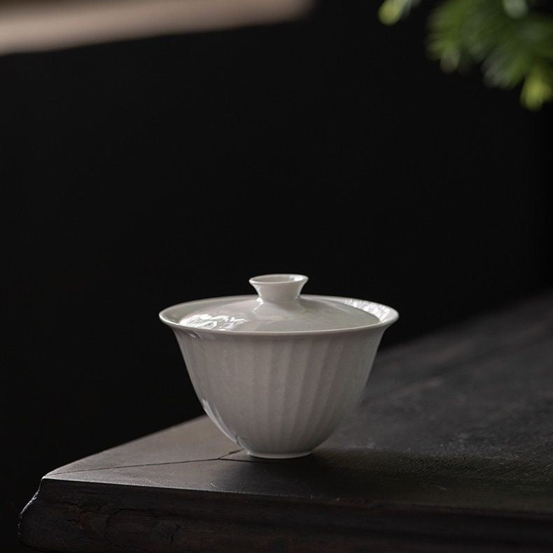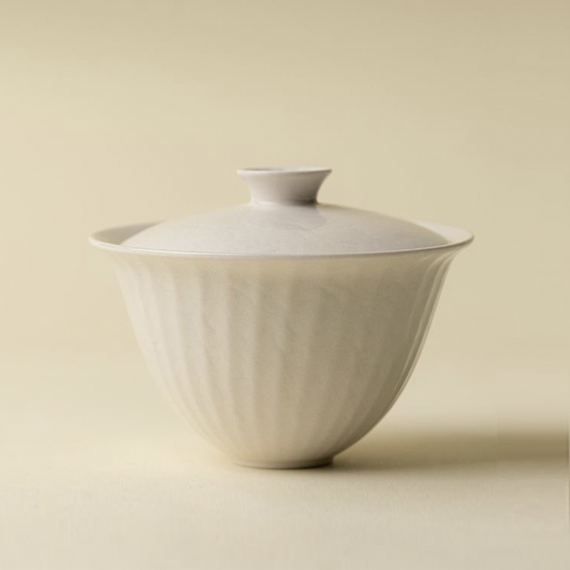 Handcrafted with a soft grass-ash glaze finish, this ceramic gaiwan (lidded bowl) has a clean, minimalist look and a comfortable hand feel. The gently fluted body improves grip, while the lid-and-bowl fit supports controlled pours—perfect for gongfu-style brewing of oolong, pu-erh, and black tea.