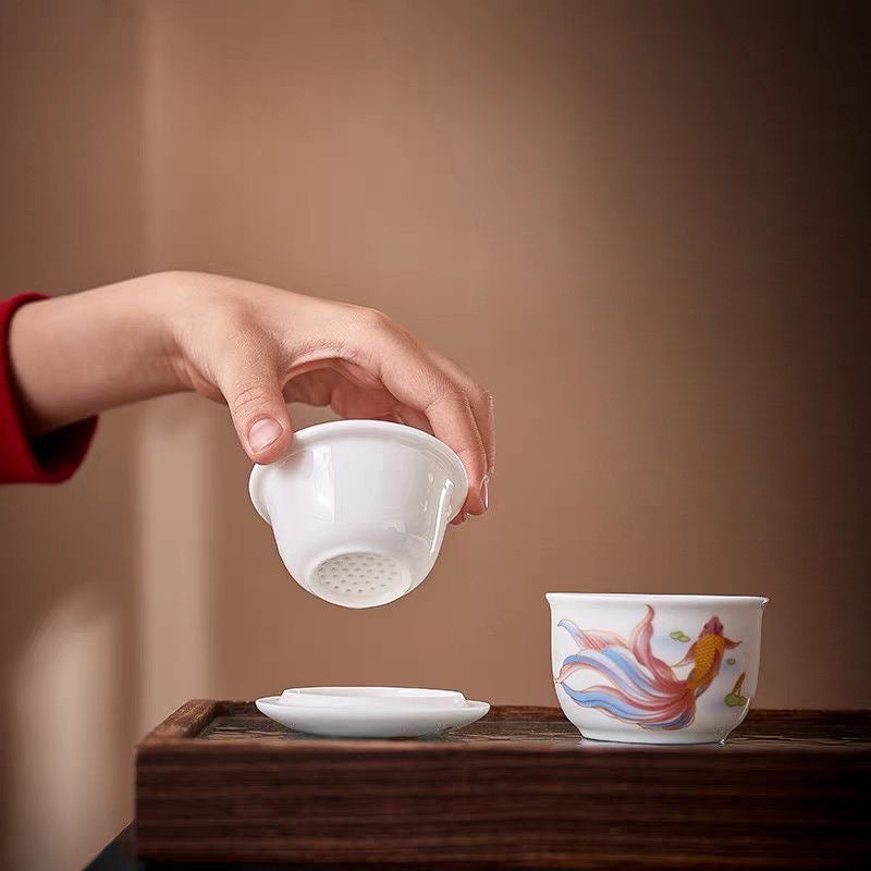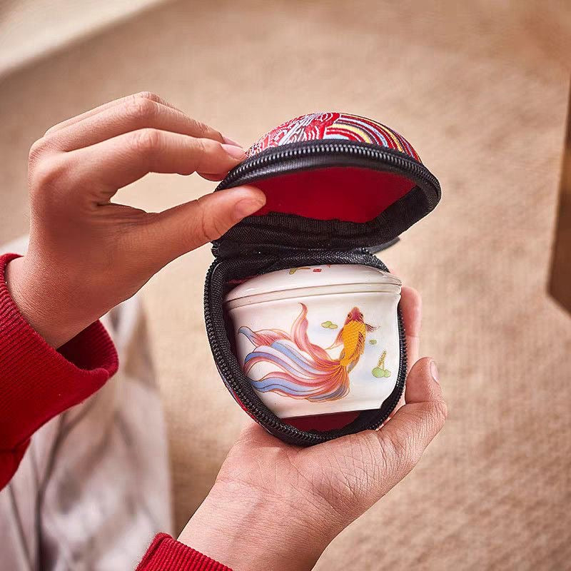杯蓋合而為一,形成一個蓋碗,方便快速沖泡,並且易於茶葉和茶湯分離。優雅的金魚圖案象徵著中國文化中的吉祥與和平。對於喜歡在旅途中或工作中品茶的女性來說,這套旅行茶具堪稱理想之選。