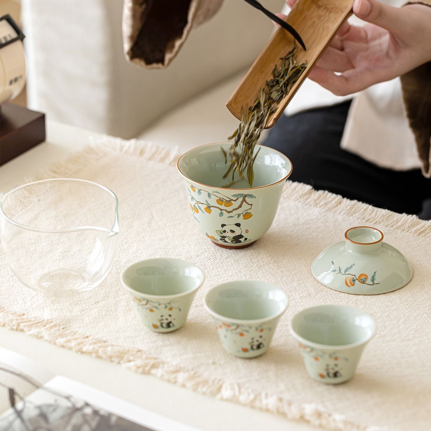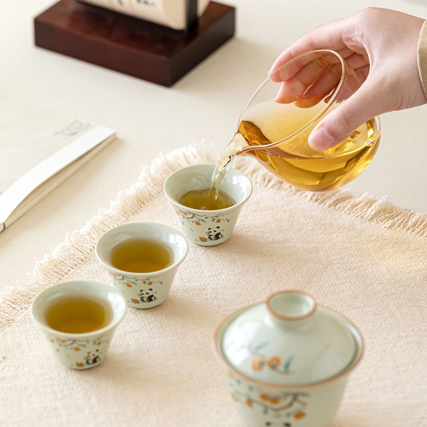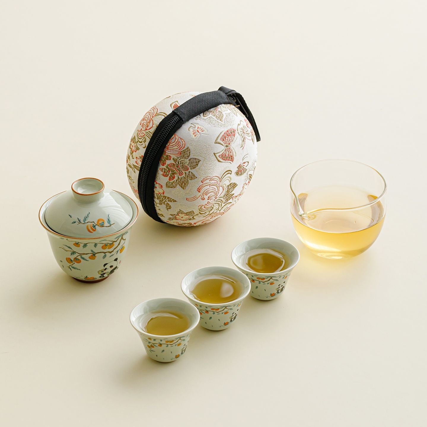 這套旅行茶具包含一個130毫升的陶瓷蓋碗(用於傳統功夫茶沖泡),一個180毫升的耐熱玻璃茶海,以及三個簡約的陶瓷茶杯,每個茶杯容量約為40毫升。輕巧便攜,非常適合想要隨時隨地體驗中國茶文化樂趣的茶友。無論是獨自享用還是與朋友分享,都堪稱理想之選。